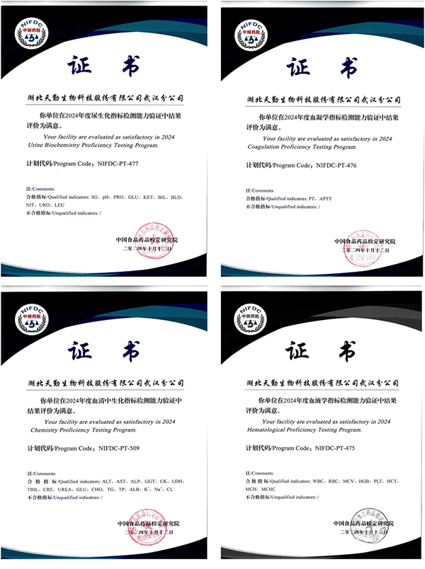 在血清中生化指標(biāo)(NIFDC-PT-509)、血液學(xué)指標(biāo)(NIFDC-PT-475)、血凝學(xué)指標(biāo)(NIFDC-PT-476)和尿生化指標(biāo)(NIFDC-PT-477)四個關(guān)鍵項(xiàng)目的能力驗(yàn)證過程中,天勤生物武漢分公司提交了全部37個能力驗(yàn)證指標(biāo),且所有項(xiàng)目均以滿分100分通過,最終獲得“滿意”的最高等級認(rèn)定。在臨床檢驗(yàn)領(lǐng)域,天勤生物武漢公司不僅配備了先進(jìn)的儀器設(shè)備,還建立了完善的實(shí)驗(yàn)室質(zhì)量控制體系,并擁有一支高技能的專業(yè)團(tuán)隊(duì),這一系列優(yōu)異的成績充分展示了天勤生物武漢分公司在臨床檢驗(yàn)領(lǐng)域的扎實(shí)功底。