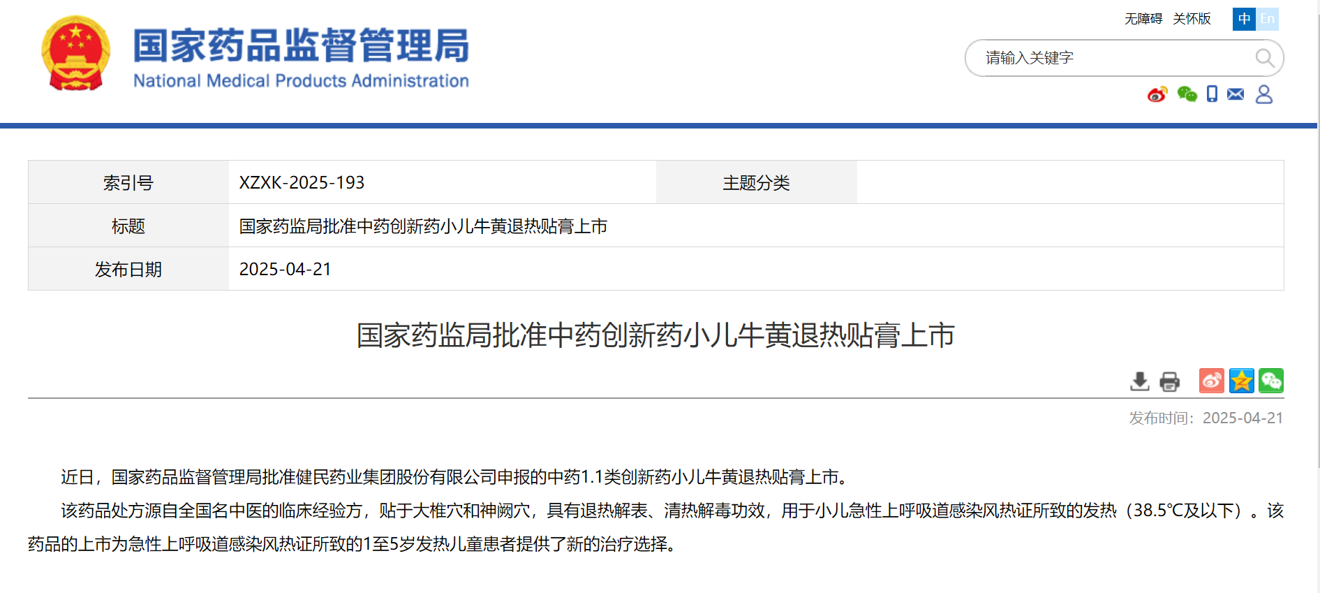 2025年4月21日,由天勤生物提供非臨床安全研究技術(shù)支持的健民集團(tuán)中藥1.1類創(chuàng)新藥小兒牛黃退熱貼膏,正式獲得國家藥品監(jiān)督管理局批準(zhǔn)上市。作為該項(xiàng)目核心研究合作方,天勤生物通過多項(xiàng)定制化毒性試驗(yàn)與安全性評價(jià)研究,為該兒科藥物獲批上市提供了科學(xué)支撐。