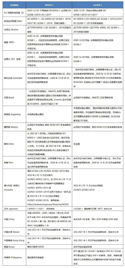 如下列出了不同國家60950-1和62368-1的接受情況,方便大家查閱。