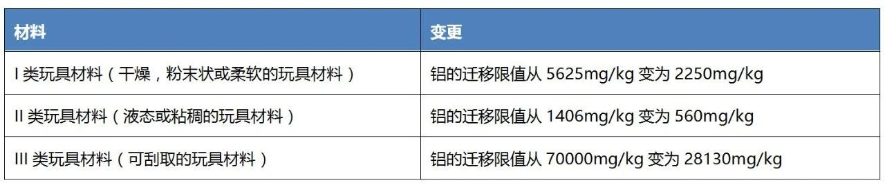 對(duì)比前一版本,本次主要修訂了鋁元素的遷移限值,詳見如下