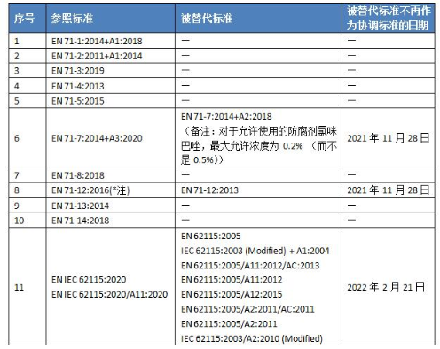 玩具安全指令2009/48/EC參照的協(xié)調(diào)標準完整列表(自2021年5月31日起)如下表: