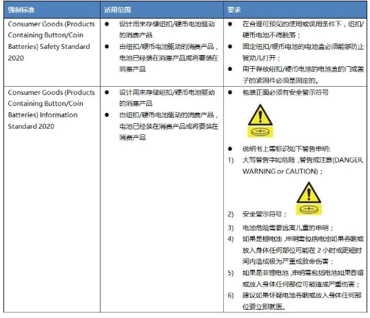 紐扣或硬幣電池可以在各種各樣的產(chǎn)品中找到,包括兒童玩具、照明產(chǎn)品、遙控器、手表等。電玩具一般使用的紐扣/硬幣電池為扁平的圓形單電池,厚度從1-11毫米不等,直徑可達(dá)32毫米。在玩耍電玩具時(shí),兒童如果不慎吞食紐扣/硬幣電池后可導(dǎo)致窒息甚至死亡。2020年12月22日,澳大利亞政府正式生效4個(gè)強(qiáng)制標(biāo)準(zhǔn)來減少因使用紐扣/硬幣電池造成的傷亡風(fēng)險(xiǎn)。強(qiáng)制性標(biāo)準(zhǔn)包括18個(gè)月過渡期,從2022年6月22日開始,供應(yīng)商必須符合該標(biāo)準(zhǔn)要求。