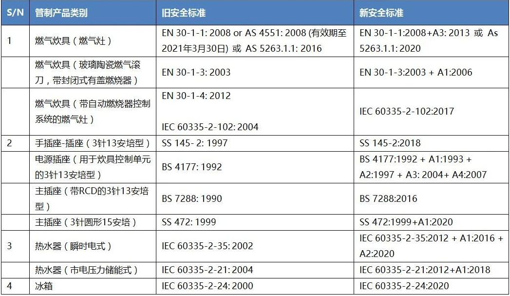 2. 自2022年7月起,下列舊安全標準的管制產(chǎn)品將不能用于重新注冊或更新。